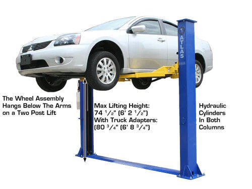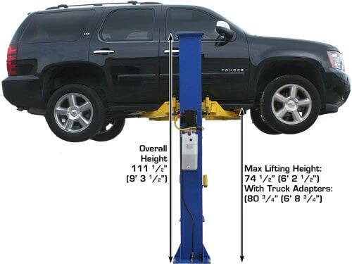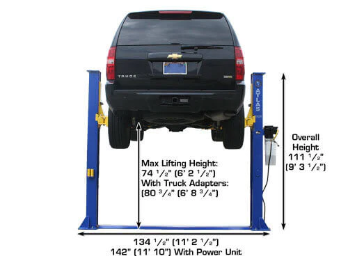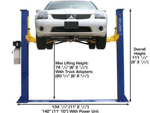 The Atlas® 9KBPX is an economically designed baseplate two-post lift great for low ceiling garages. The total column height of 111 ½” (9 feet 3 ½ inches) allows this lift to be installed in almost any professional or home garage with a ceiling as low as 9 feet 6 inches.