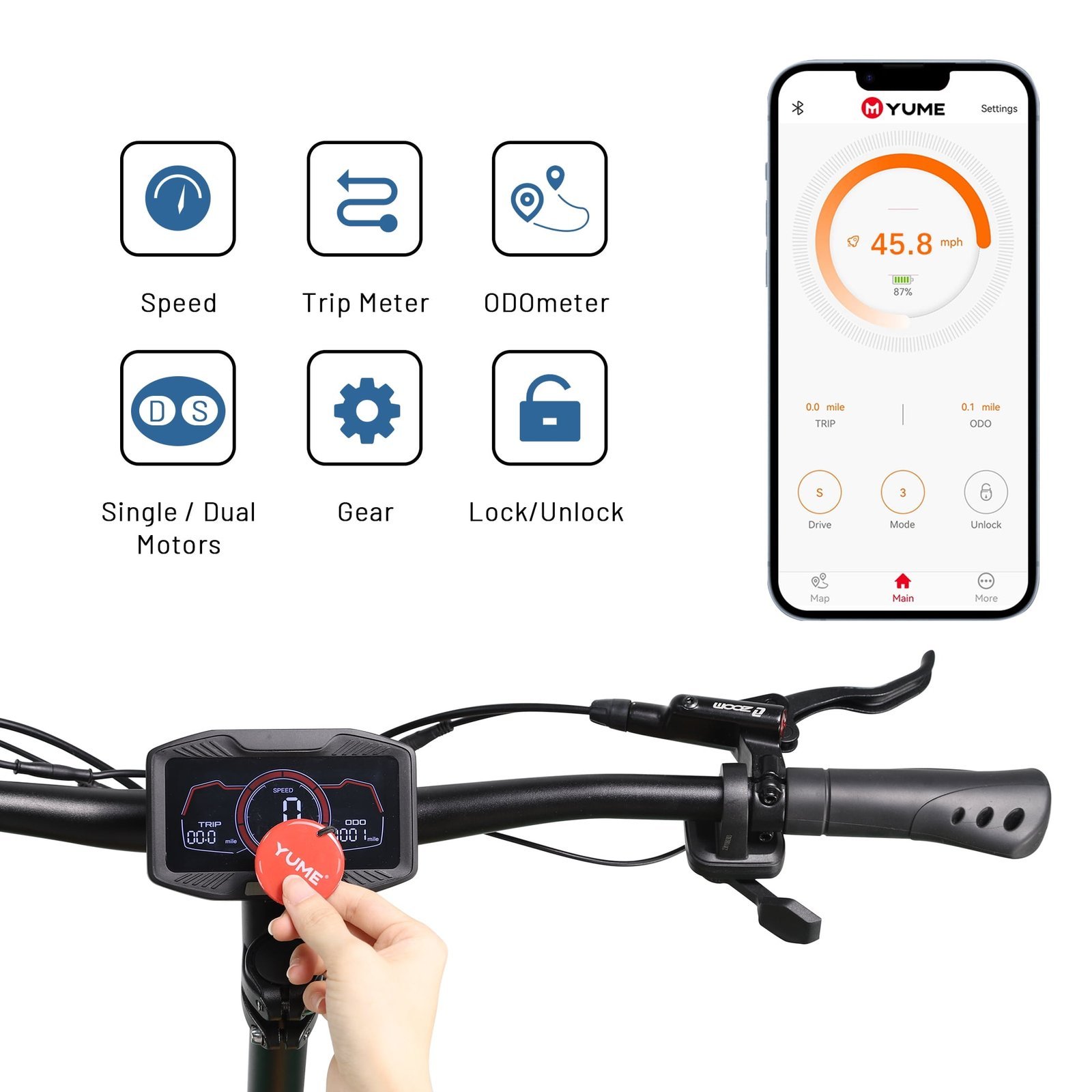 Y11+ experience unbelievable acceleration and effortless hill climbing with 6000W high-performance dual motors and an advanced sine wave controller. 60V 31.5AН Long-lasting Lithium Battery for Safety, Dual Charging Ports. Y11+ mid-display smart display can connect the Yume Ride app for more functions, Experience seamless connectivity, and take your ride to the next level. Y11+ scooter overall size(LxWxH[max]): 47*28*55 inch, Package Weight: 118(with seat add 2.5kg), Package size: 52*15*50 inch.