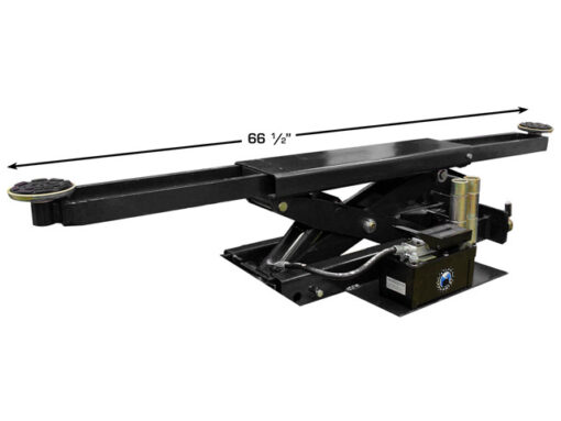 The Atlas® RJ8000 air/hydraulic rolling jack has telescoping arms that can be extended over the runways of a four post lift. The lift pads at the end of these arms can be positioned under the lifting points that are located over the runways of that four post lift. This rolling jack is equipped with expandable rail supports which adjust to fit between the runways of many different four post above ground lifts. These supports have a unique roller system that allows the rolling hydraulic jack to glide easily under the entire length of the vehicle.