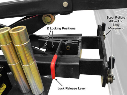 The Atlas® RJ8000 rolling bridge jack comes standard with a set of peg style truck adapters which increases the lifting height of the lift pads. These truck adapters will allow the RJ8000 to raise most pick up and larger trucks that will sit higher than the average passenger car. The RJ8000 rolling hydraulic jack features two solid locking positions that are used when the vehicle is to be suspended above the runways. When the locking positions are engaged, the hydraulic pressure from the lifting cylinder of the jack is eliminated. (These locks act much like a pair of jack stands after you lift a vehicle off the ground with a service jack).
